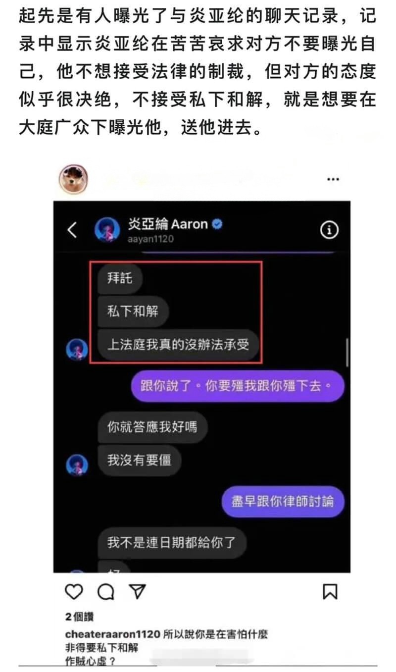 炎亚纶在邱耀乐发文相隔 2 小时 40 分后,以本名吴庚霖在脸书坦认两人曾经交往,也确实有过私密视频,但并非他本人流出,“当时经过我的调查,最大的可能是某天我去修手机的时候被外流的。” 他表示相当珍惜跟耀乐的感情,也很抱歉造成这样的结果,“如果你愿意的话,我愿意再当面跟你道歉,也愿意陪你走过一切的伤痛,和进行后续能弥补的一切。”